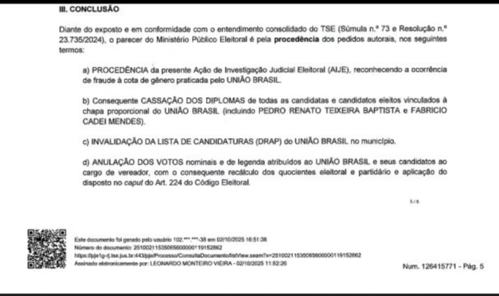 Cassação dos mandatos de todos os eleitos pelo União Brasil, incluindo Pedro Renato Teixeira Baptista e Fabricio Cadei Mendes;