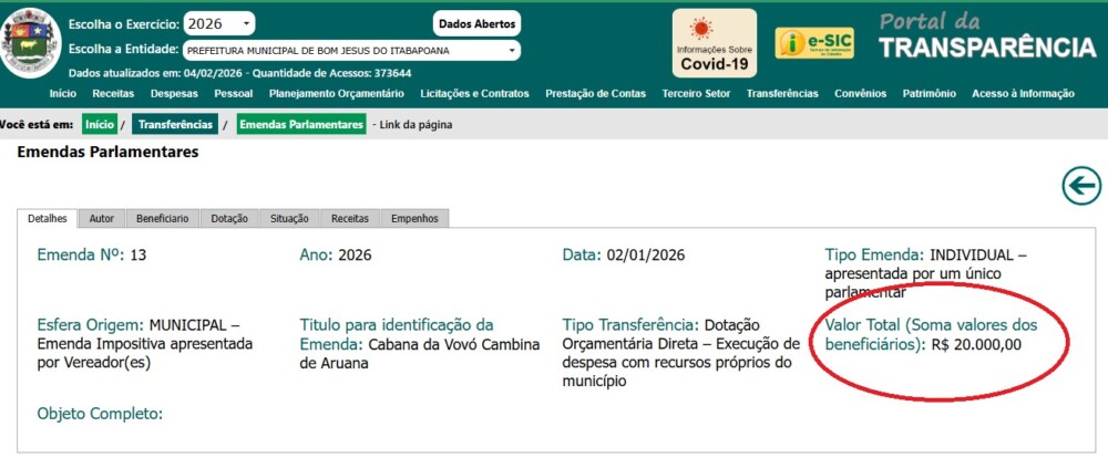 Em Bom Jesus do Itabapoana, o blogueiro Wisley Fernandes trouxe à tona duas emendas parlamentares de R$ 20 mil cada, protocoladas em 02 de janeiro de 2026, de autoria dos vereadores Haroldo Garcia e Toizinho. Os recursos foram destinados à organização religiosa Cabana da Vovó Cambina, localizada em Aruanã e vinculada, segundo registro de CNPJ, ao município de São José de Ubá, fora da cidade que concedeu os votos aos parlamentares.